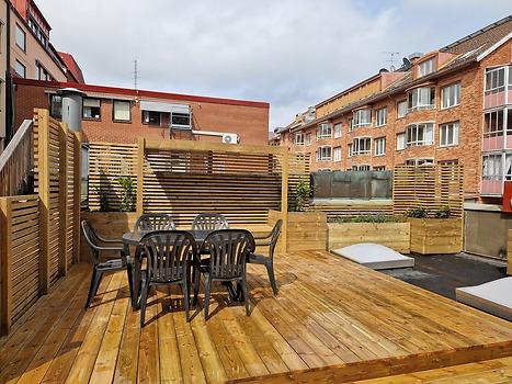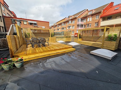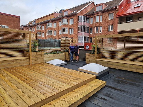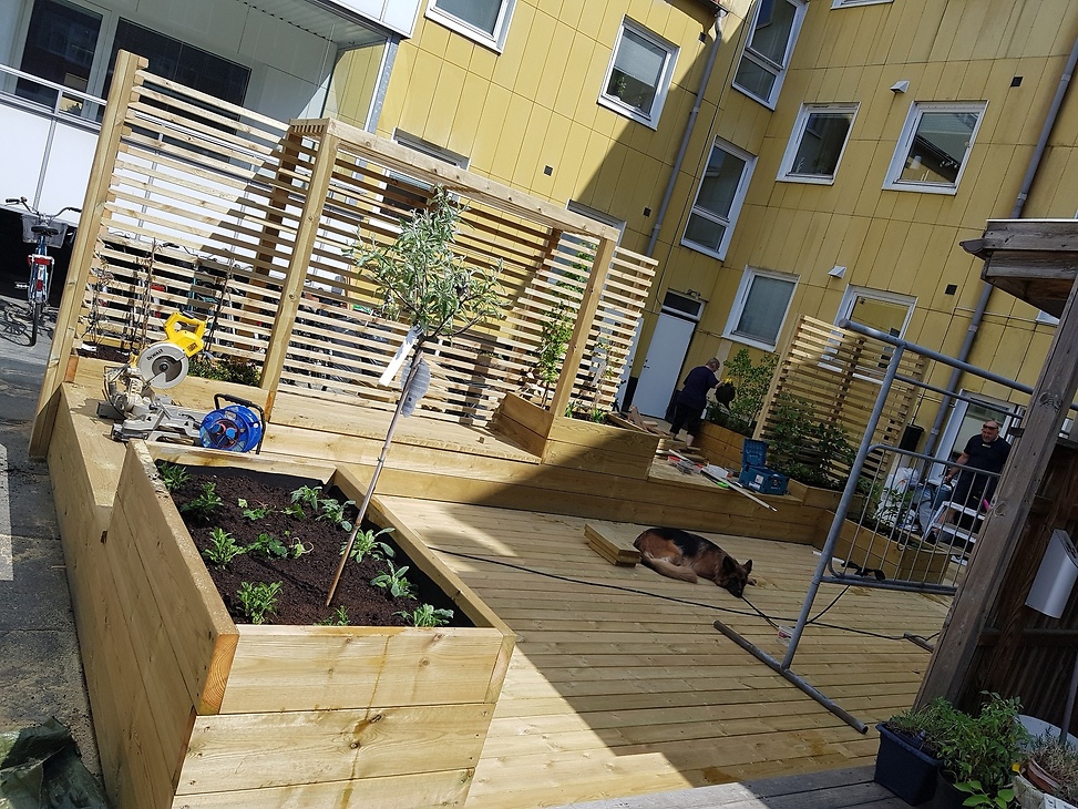 Då takpappen behövde bytas på innergården Trädgårdsgatan 4 / Kilbäcksgatan 29 så fick vi ta bort alla växter och uteplatser. Igår kunde Sofie och Cecilia äntligen avsluta projektet genom att plantera nya växter. Nu hoppas vi hyresgästerna skall få en njutbar plats igen.