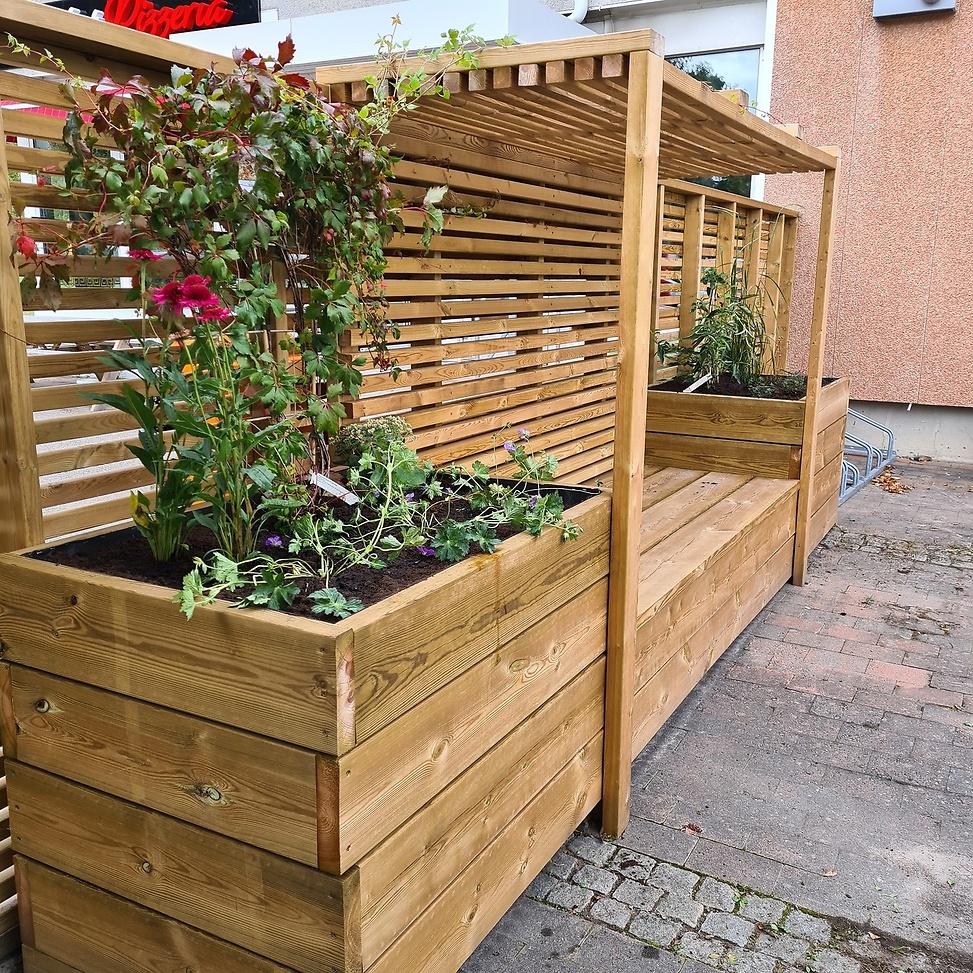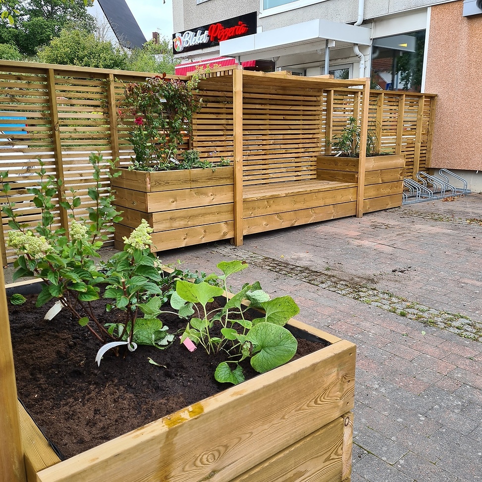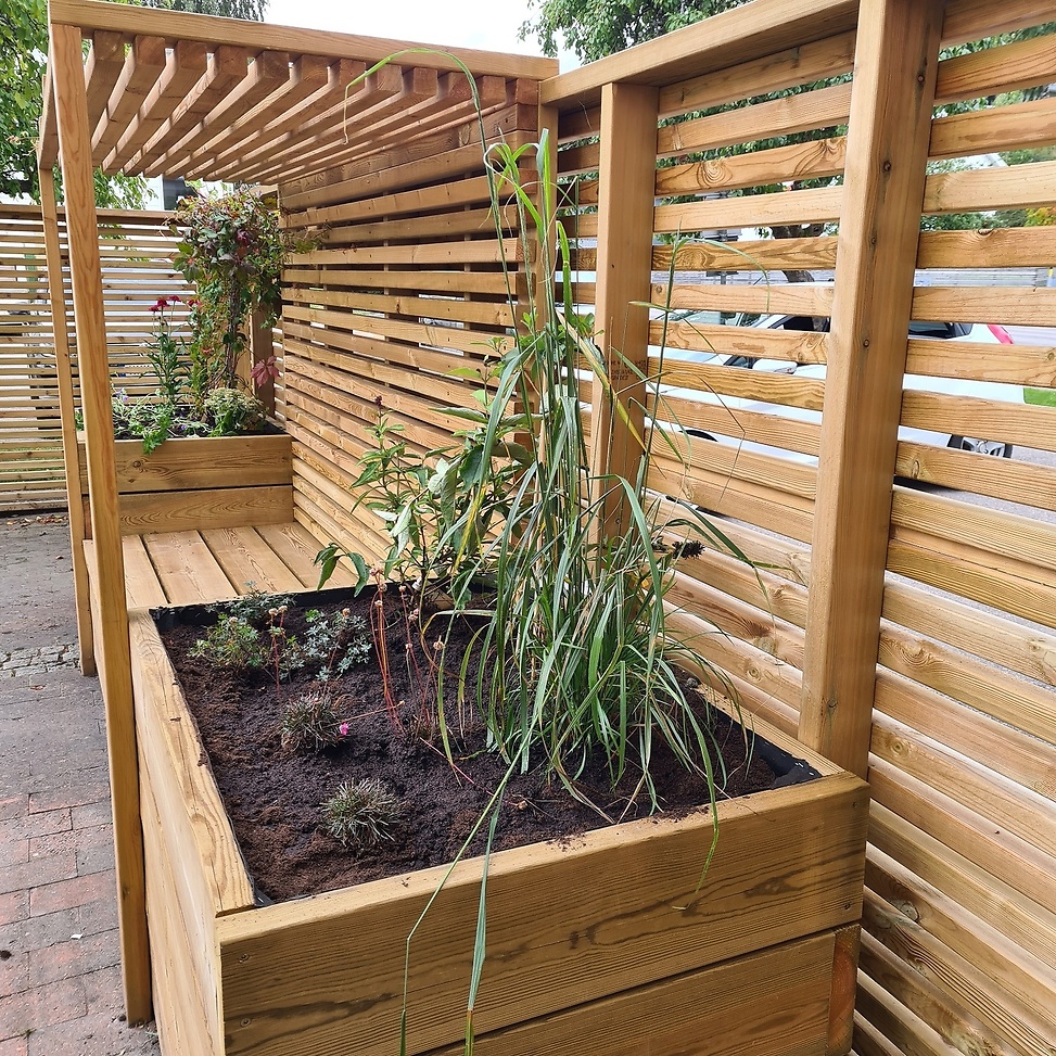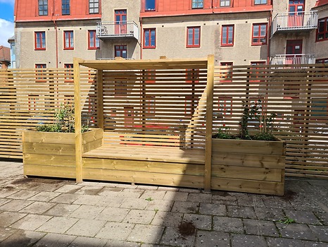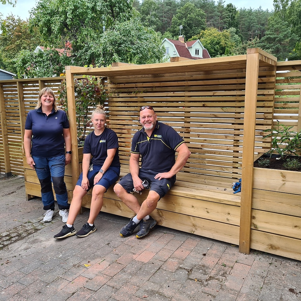 Patrik, Sofie och Cecilia stod för arbetsinsatsen med planteringen och BFK Bygg AB har snickrat.