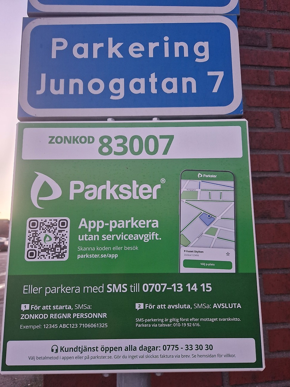 Vi har tagit bort p-skiva och gått över till Parkser på vår parkering på Junogatan 7 och Vesslevägen 1, det går fortfarande att parkera gratis när man är incheckad i appen. Villkoren för respektive parkering finner ni i appen.